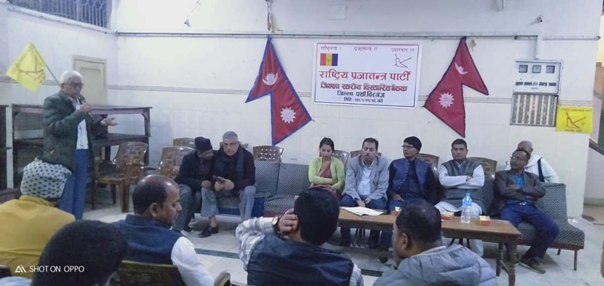 वीरगंज, १२ फागुन । राष्ट्रिय प्रजातन्त्र पार्टीको जिल्ला स्तरीय बिस्तारीत बैठक राणीसतीको सभाहलमा सम्पन्न भएको छ । पार्टीको जिल्ला अध्यक्ष सुमेश्वरनाथ उपाध्यायको सभापतित्वमा भएको कार्यक्रममा प्रदेश अध्यक्ष भरत गिरी, संघीय सांसद माननीय बिना जैसवाल, केन्द्रिय सदस्य अंगद ठाकुर, राधेश्याम साह, वीरेन्द्रलाल कर्ण, जिल्ला उपाध्यक्ष शान्ति देवि खड्का, अबध किशोर साह, क्षेत्र नं–१ का अध्यक्ष अर्जुन सिहं ठकुरी, नेता किरण मान डंगोल, दिपेस साह, परमानन्द साह जिल्ला प्रबक्ता शम्भु घिमिरे लगायतका थुप्रै नेता कार्यकर्ताहरूको उपस्थिति रहेको थियो । बैठकमा यही फागुन २१ गते जनकपुरमा राप्रपाको पर्साबाट ५०० जना उपस्थिति गराउने प्रतिबद्धता ब्यक्त गर्दै राजाबाट जनतामा बक्सेका कुराहरू मनन गर्दै देश र जनता बचाउन कसरी आन्दोलनको शुरूआत गर्ने र संगठन कसरी तीब्र रूपमा अगाडी बढाएर बैशाख मसान्तसम्म जिल्लाको अधिवेशन सम्पन्न गर्ने बिषयमा बृहत छलफल गरेर कार्यक्रम सम्पन्न भएको थियो ।